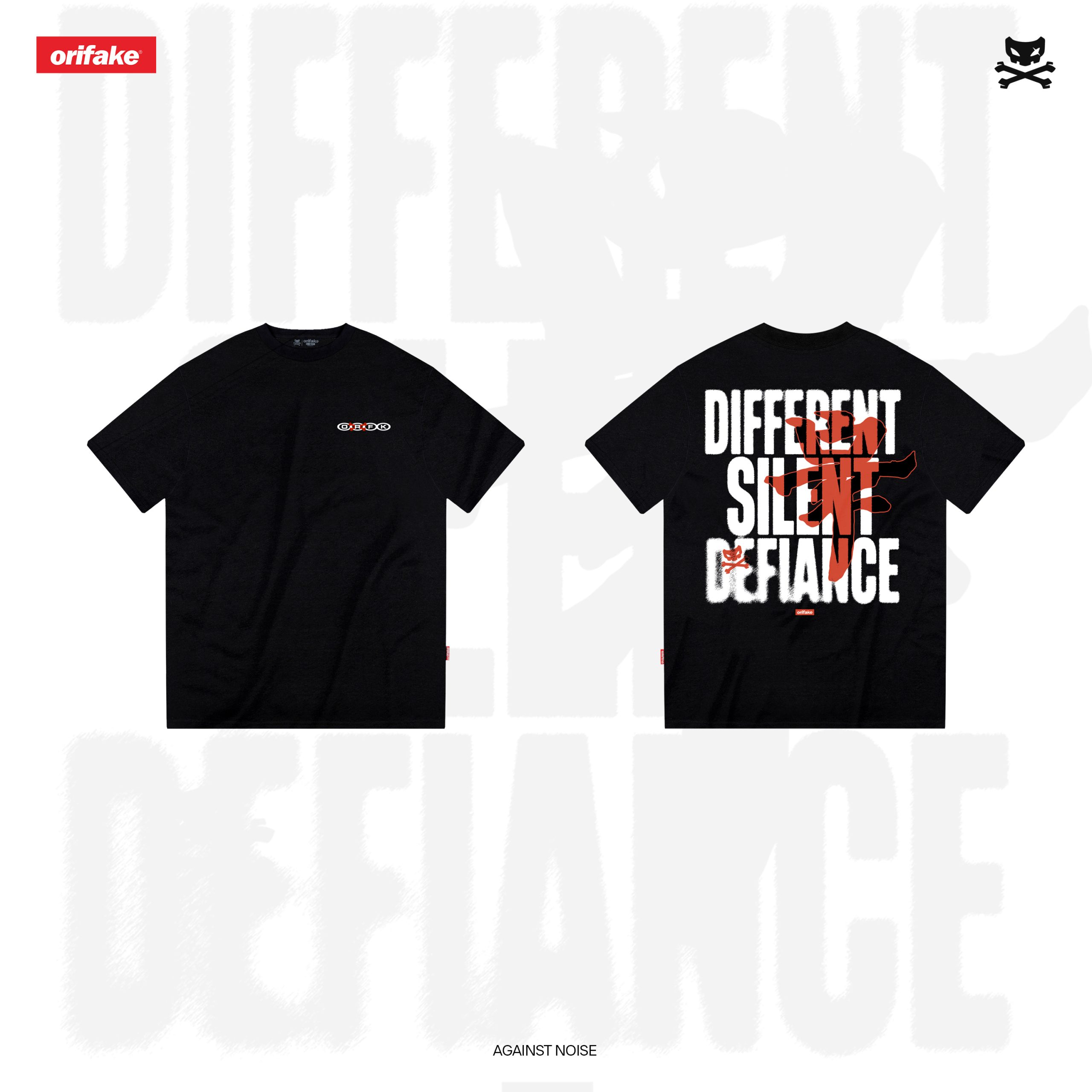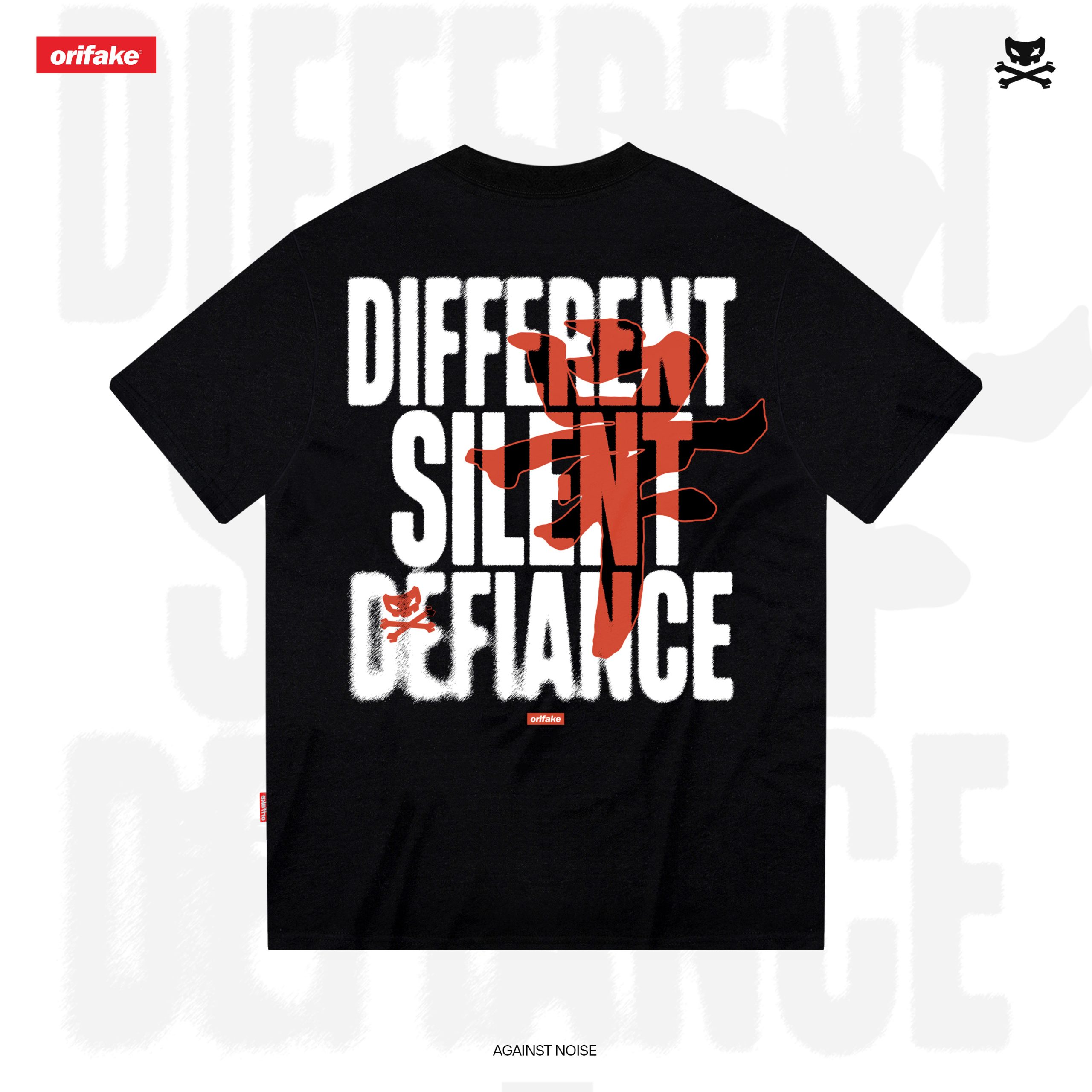 “Against Noise” represents the power of silent rebellion — a statement that challenges the chaos of conformity through calm, defiant action. The back features bold typography that reads “DIFFERENT SILENT DEFIANCE,” contrasted by a striking red graphic symbolizing strength and individuality within silence.